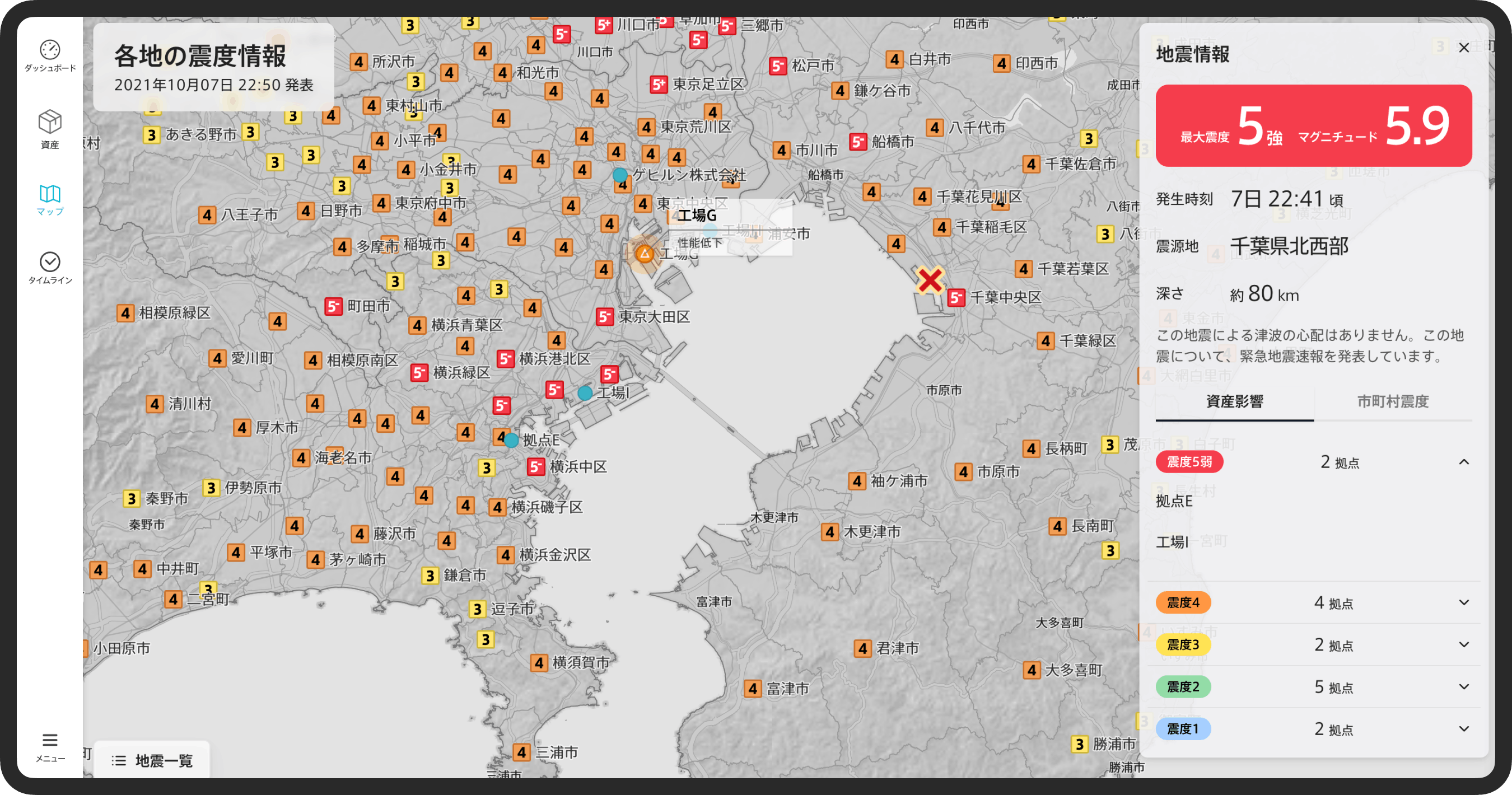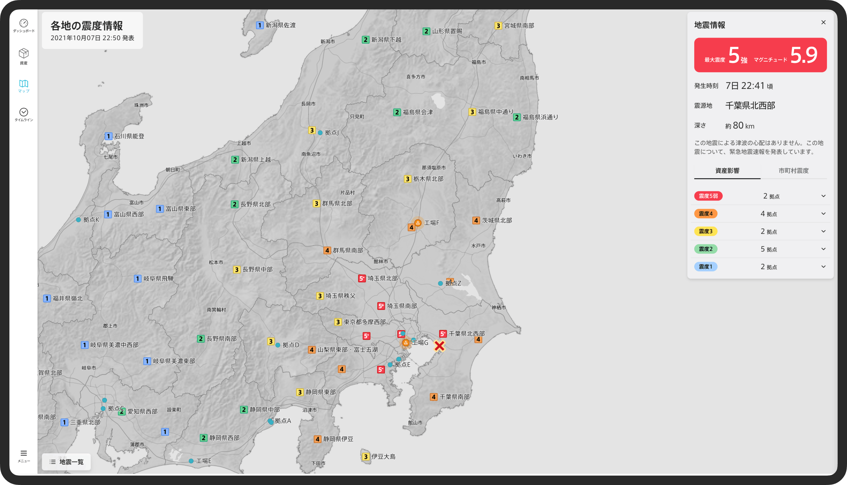 各地の震度情報、震源情報を即座に可視化。複数拠点への影響を地図上で一覧し、対応の優先順位を判断できます。
