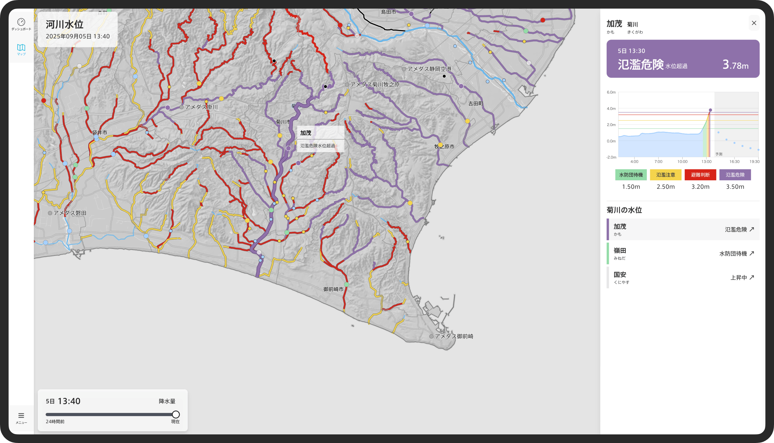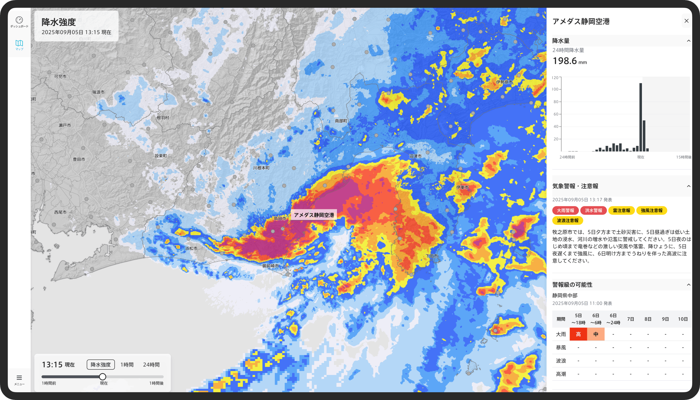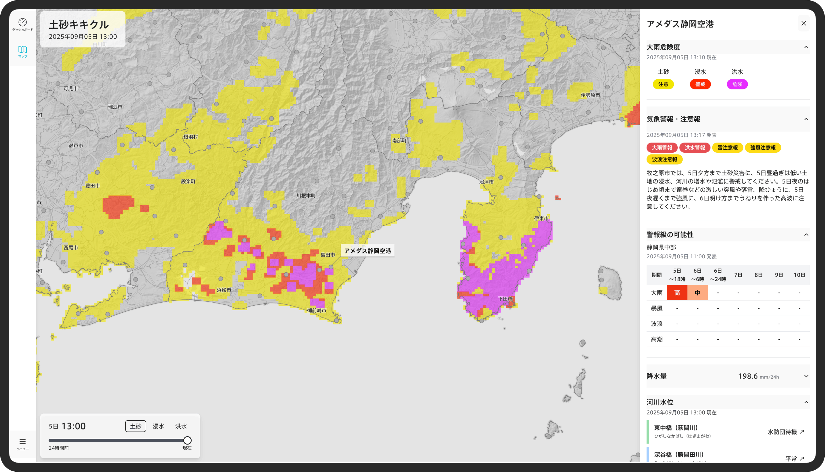 大雨による土砂災害・浸水害・洪水害の危険度を確認。複数の危険度分布を一つの画面で比較しながら、拠点周辺のリスクを把握できます。