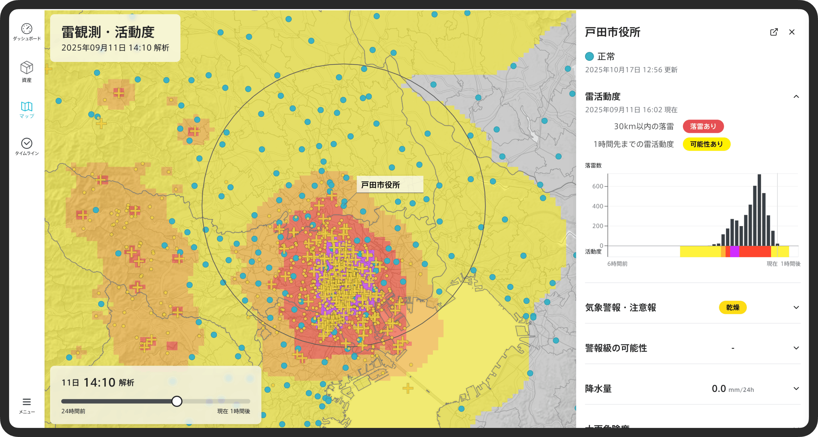 雷の激しさや、雲放電および対地放電(落雷)の状況をリアルタイムに更新します。