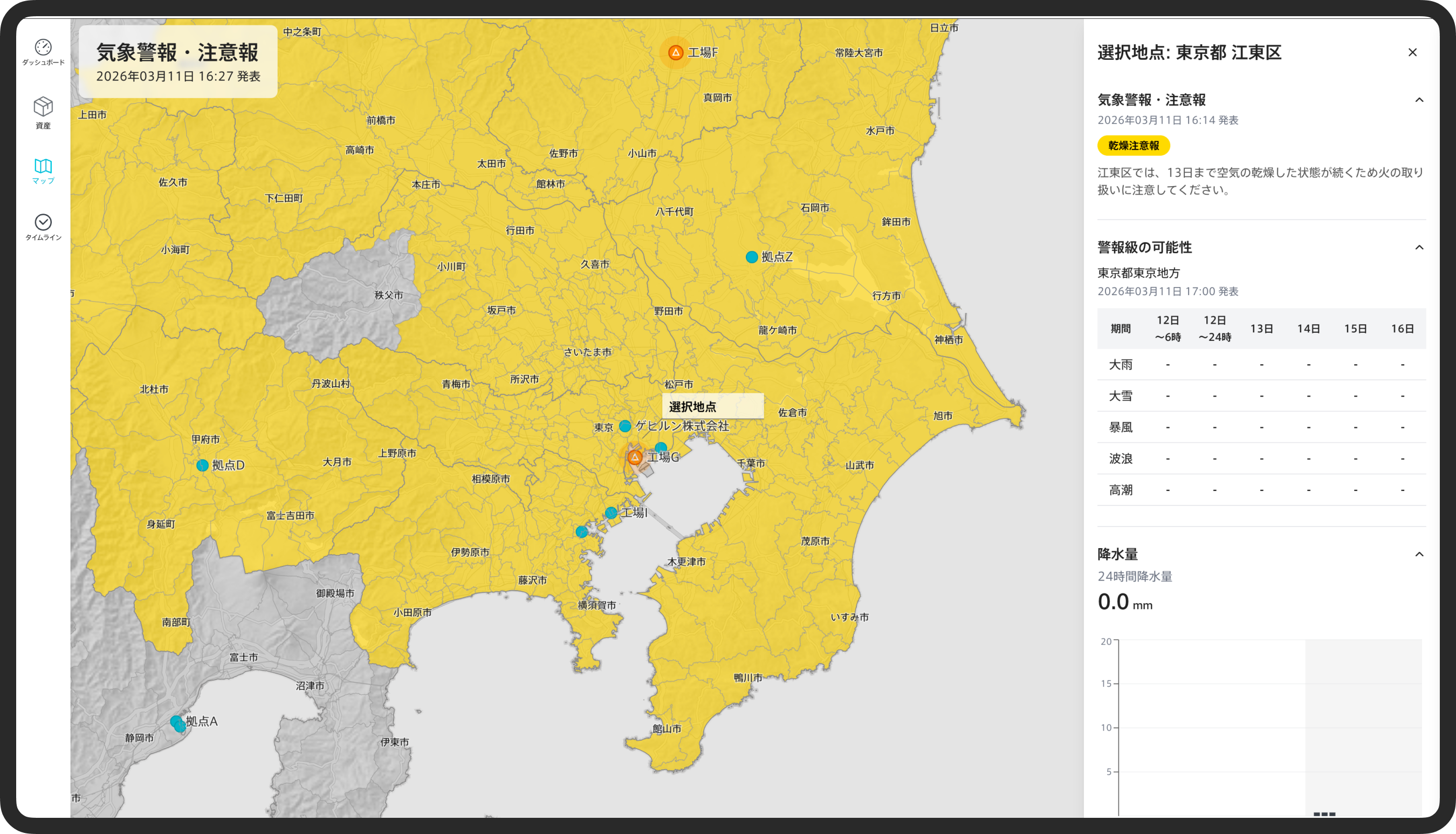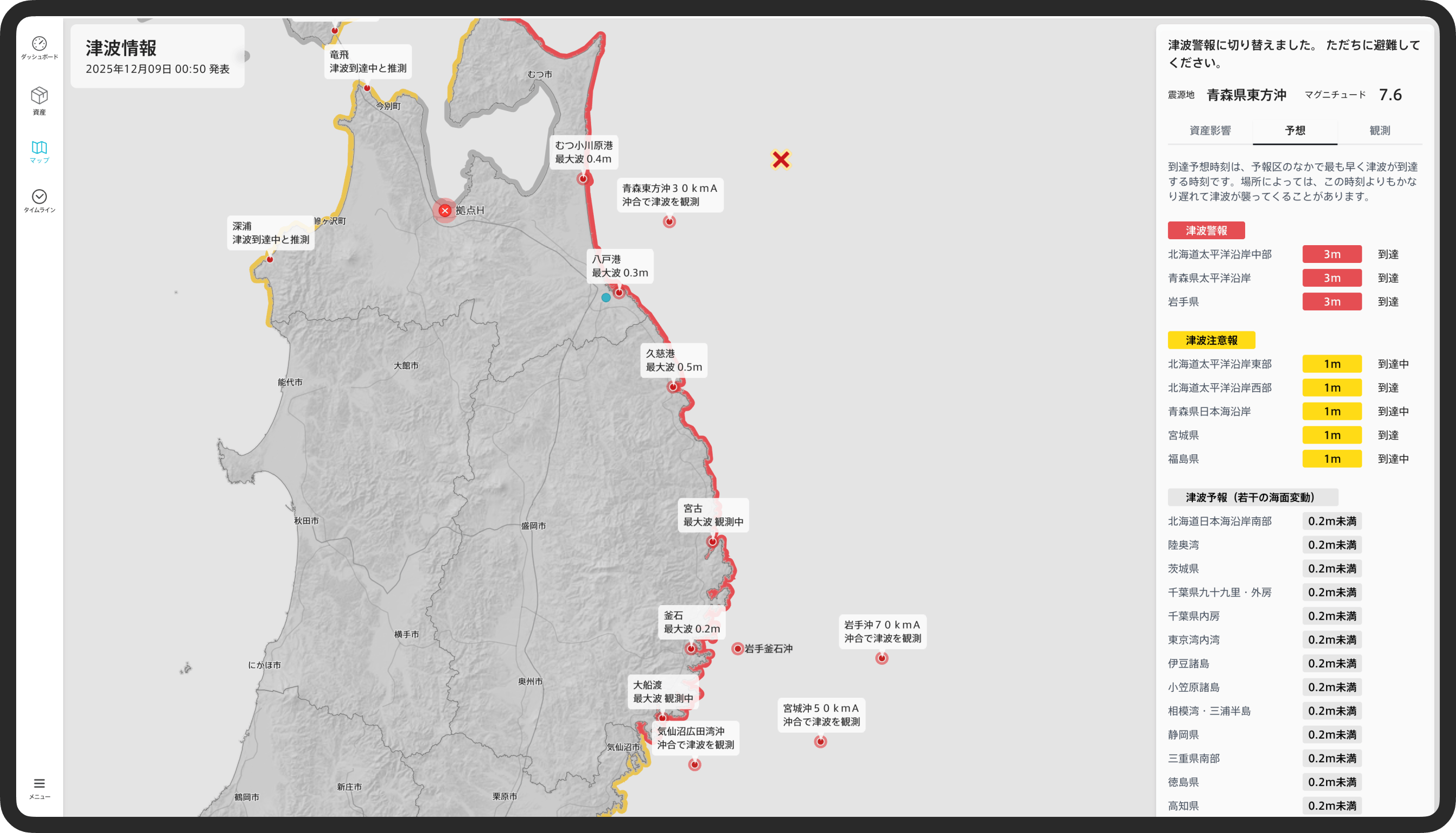 津波警報・注意報と観測情報を即座に可視化。複数拠点への影響を地図上で一覧し、対応の優先順位を判断できます。