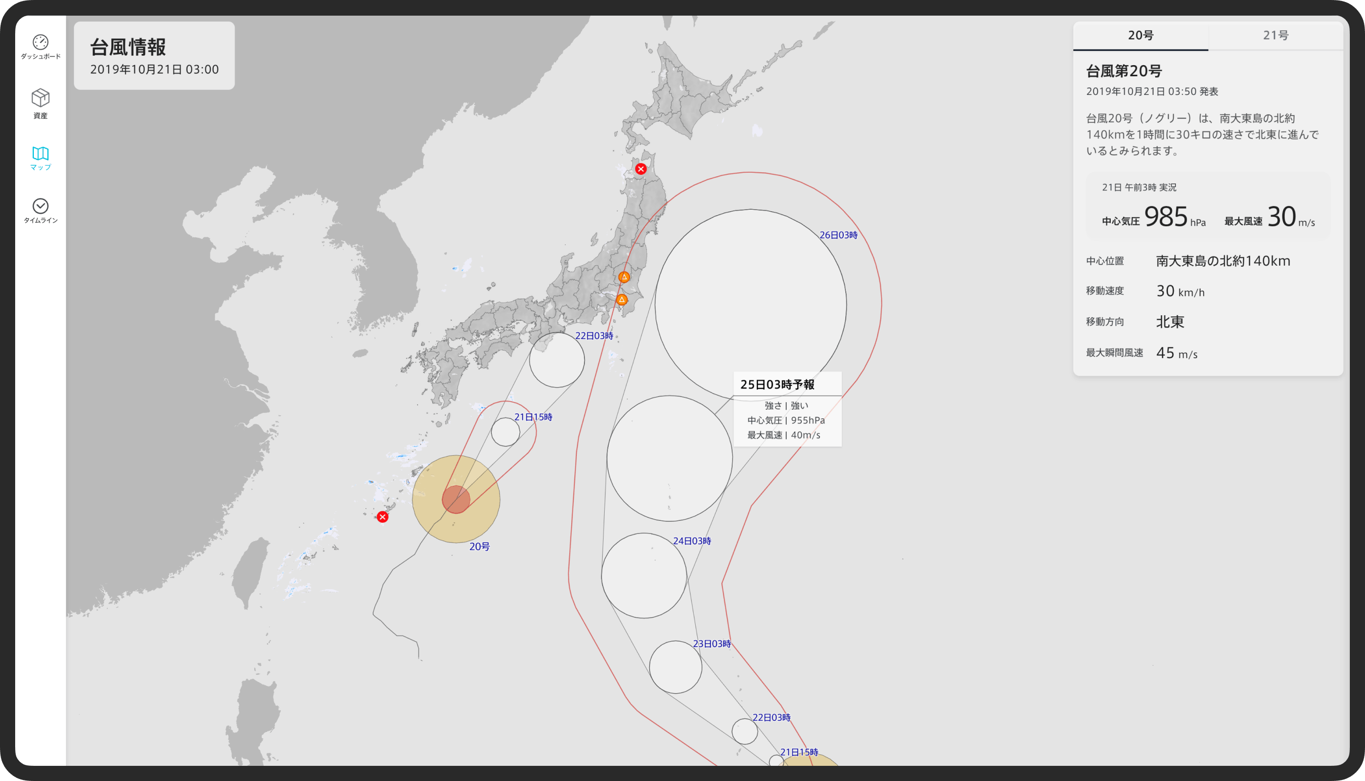 企業が登録した拠点、車両、工場、サプライチェーンなどの資産情報を地図上にマッピングし、ハザード情報と重ねて表示します。